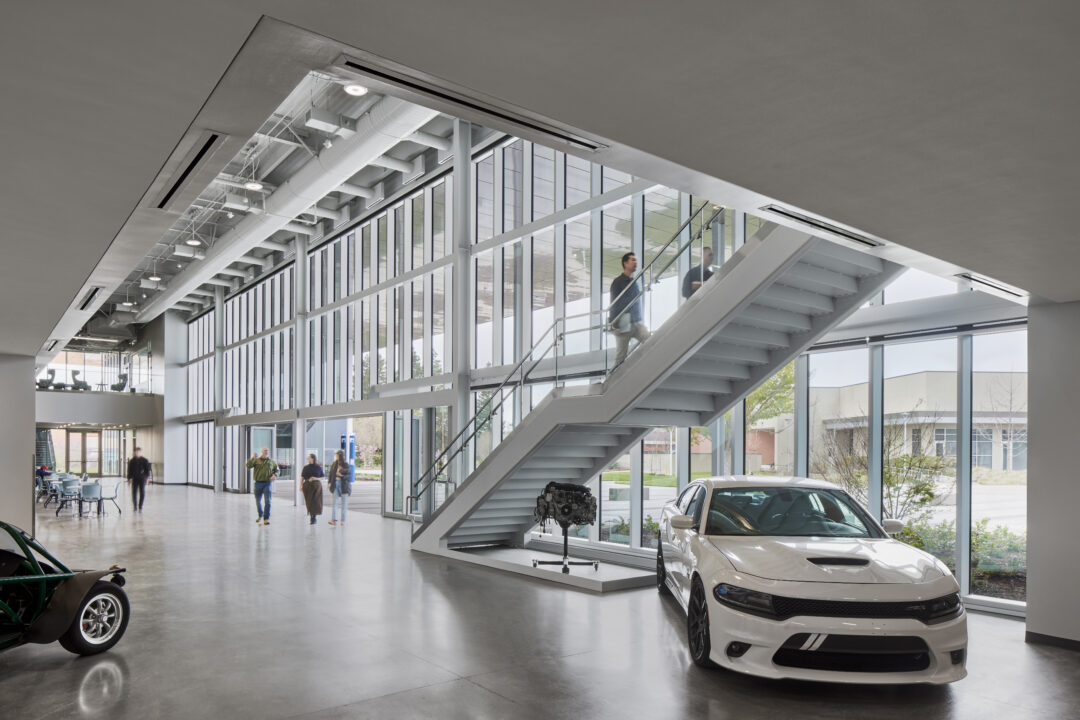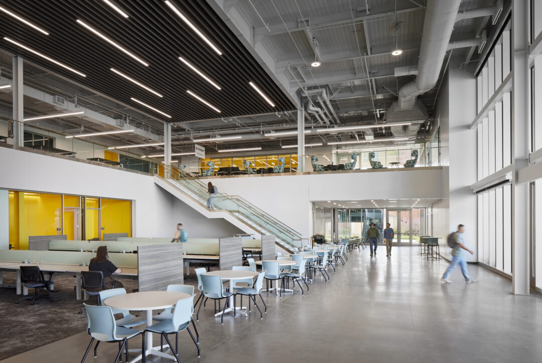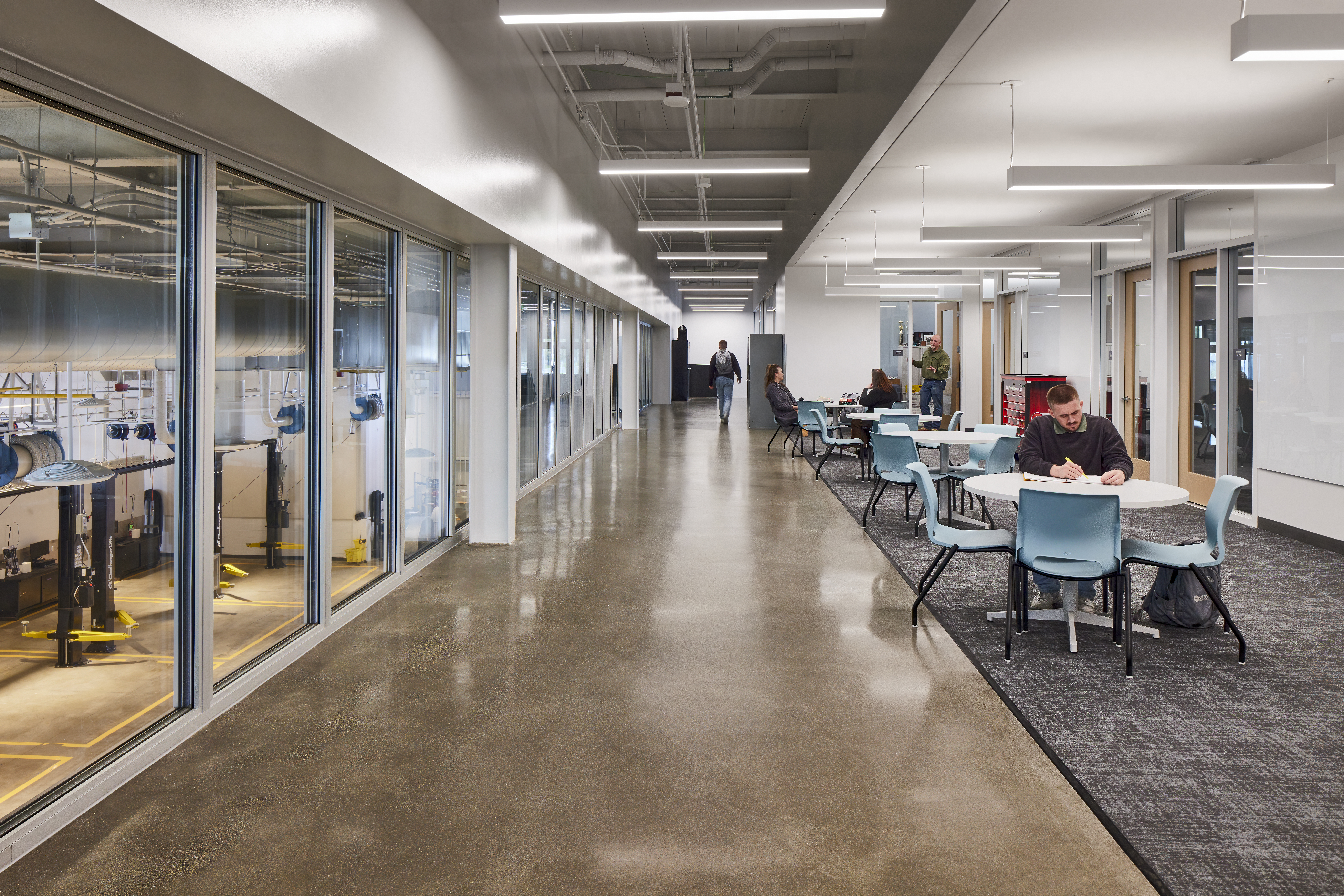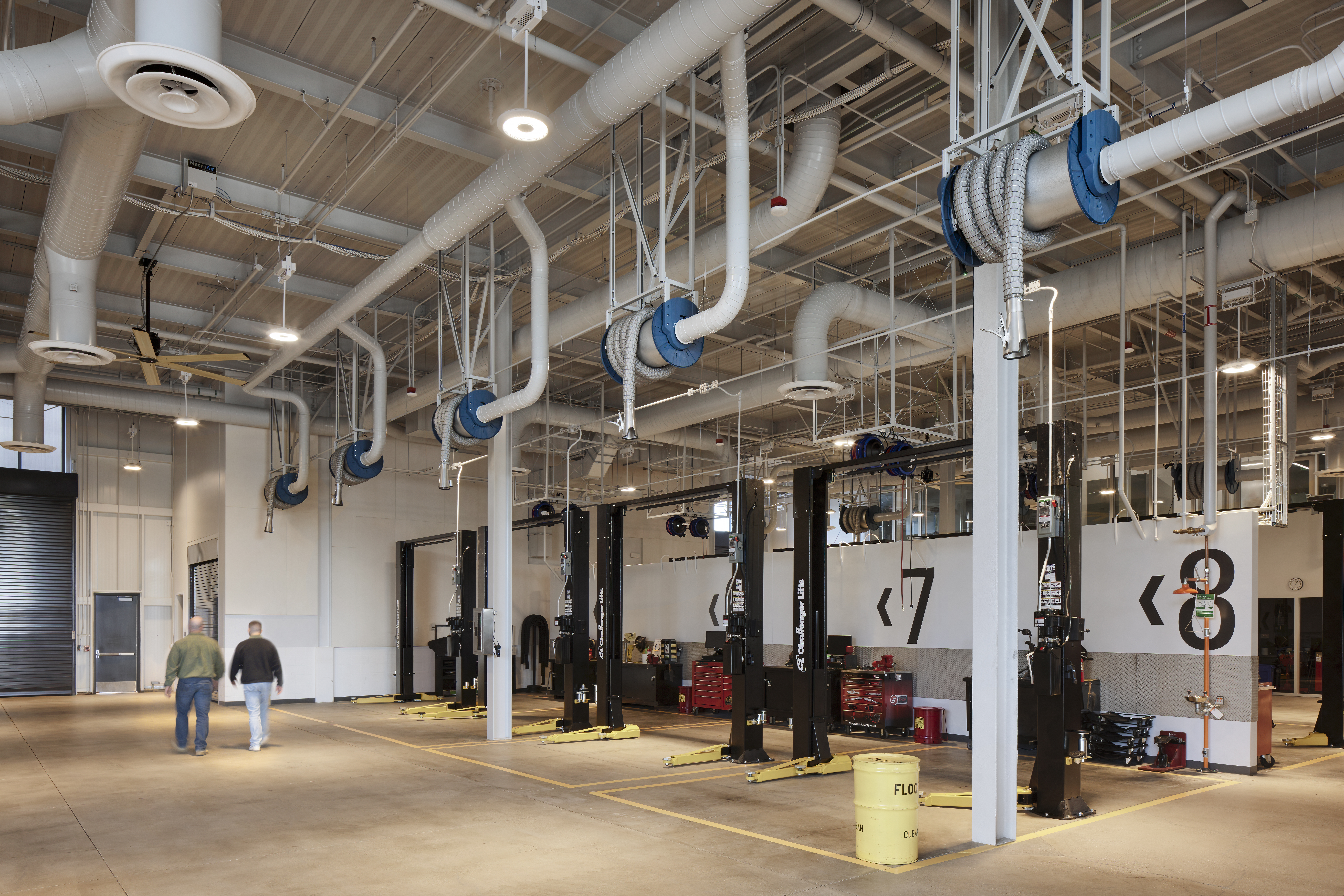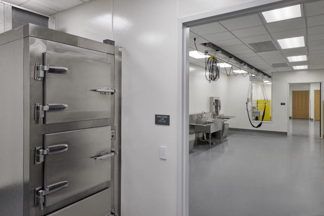 The two-story project, utilizing 100,919 square feet with 26 classrooms and specialized lab spaces offers specialized learning opportunities such as: a state-of-the-art automotive shop, welding booths and machine shop, electronics and soldering labs, and solar energy training. Also offering a unique opportunity by way of a Funeral Services Suite which includes a fully operational mortuary, embalming room, reception area and chapel. Additional amenities include a Design and Technology Hub, Maker Space, and video and audio recording studio.