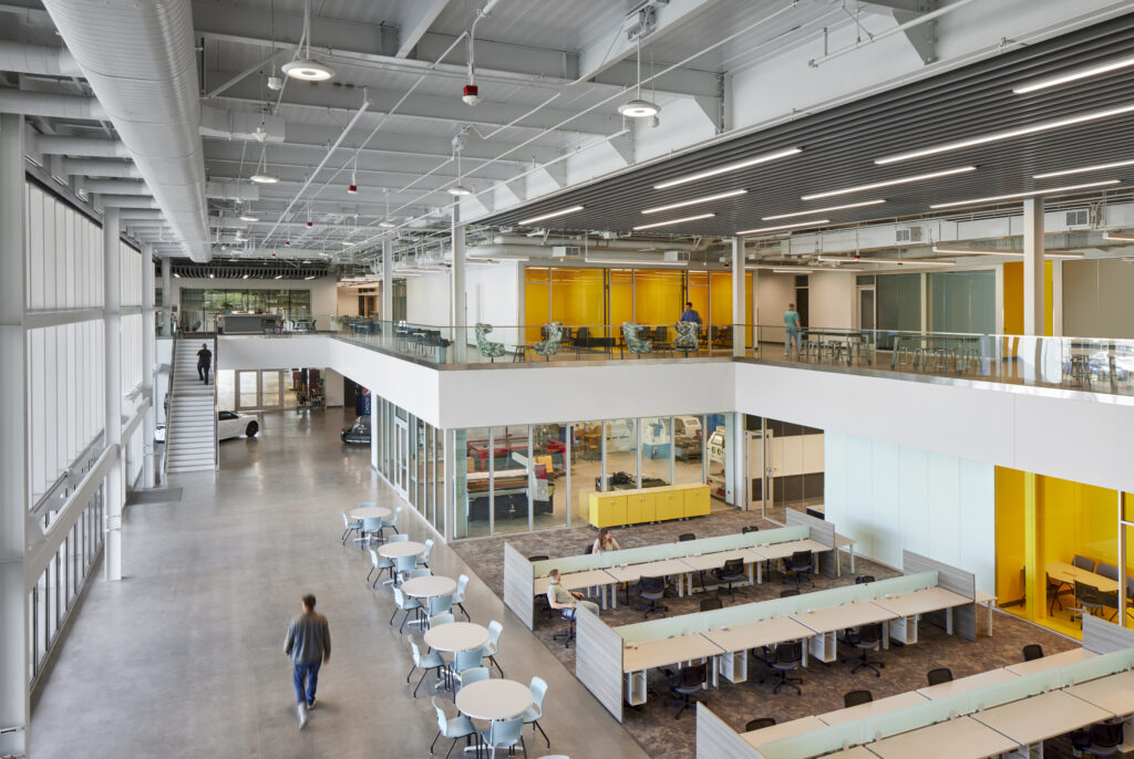 The two-story project, utilizing 100,919 square feet with 26 classrooms and specialized lab spaces offers specialized learning opportunities such as: a state-of-the-art automotive shop, welding booths and machine shop, electronics and soldering labs, and solar energy training. Also offering a unique opportunity by way of a Funeral Services Suite which includes a fully operational mortuary, embalming room, reception area and chapel. Additional amenities include a Design and Technology Hub, Maker Space, and video and audio recording studio.